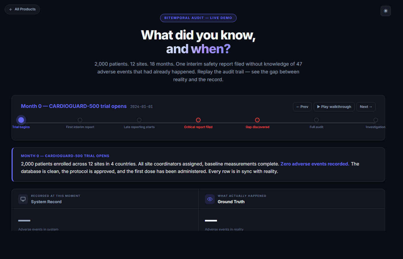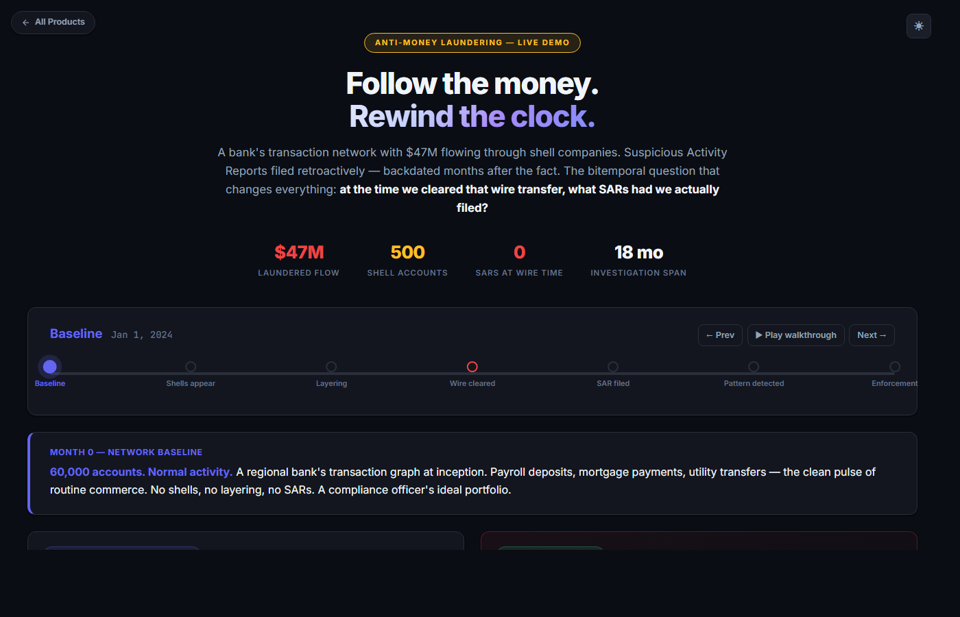 Bitemporal by default. Agent memory built in. Every mutation versioned, every moment reconstructible, every agent action replayable. Built for the regulated industries where "we don't know" isn't an answer — and for the AI agents that need to remember what they knew when.