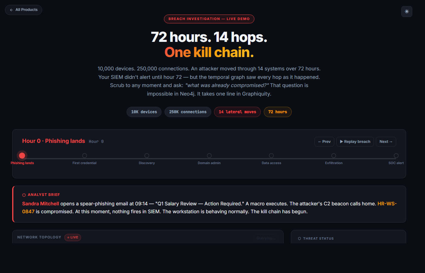 Other graph databases are great at relationships. But they don't know what time it is. Graphiquity was designed for temporal queries, audit trails, and compliance from day one.