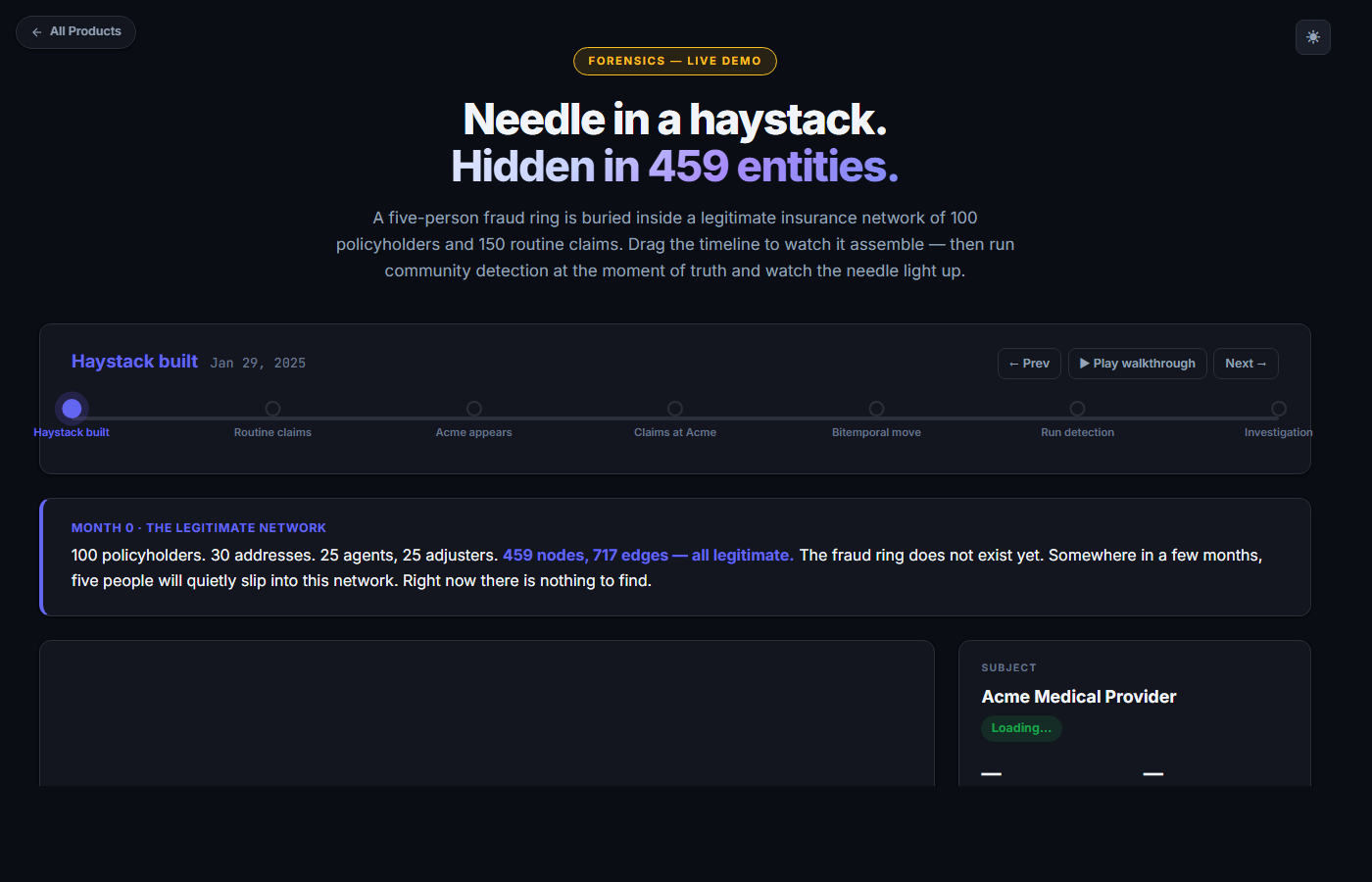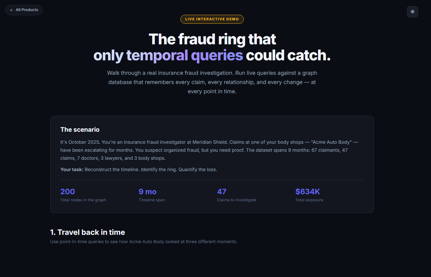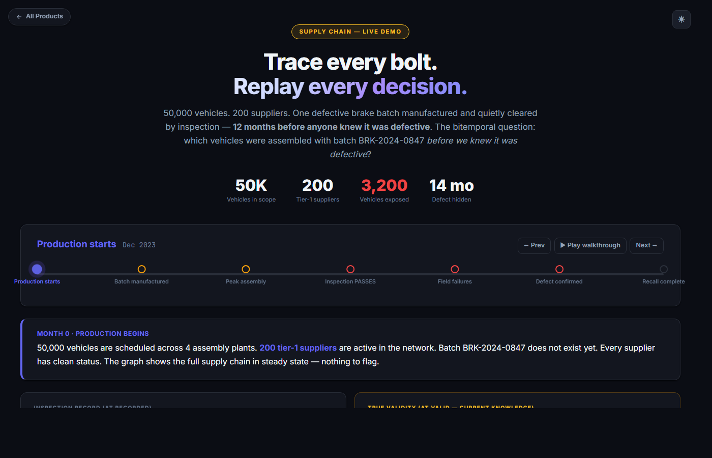 Real data. Real queries. Six industries showing bitemporal audit, graph traversal, and compliance trails.